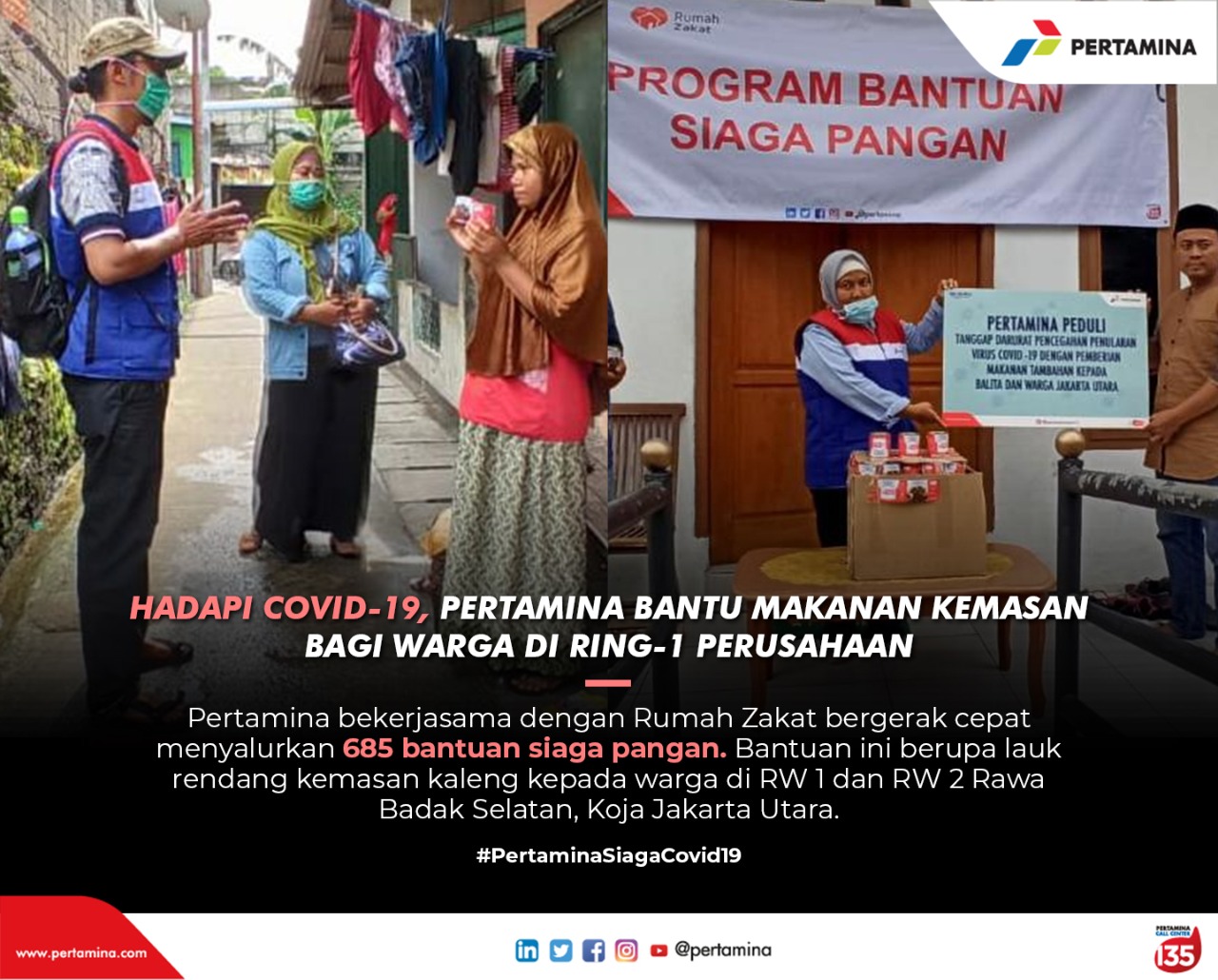 PT Pertamina (Persero) terus memperluas cakupan bantuan tidak hanya fokus di Jakarta sebagai pusat penyebaran Corona Virus Disease 2019 (COVID-19) tetapi hingga Batam, Kepulauan Riau serta Jayapura, Papua. Bantuan yang diberikan juga beragam meliputi masker, Alat Pelindung Diri (APD), hand sanitizer, cairan disinfektan, Sembako serta makanan siap santap.