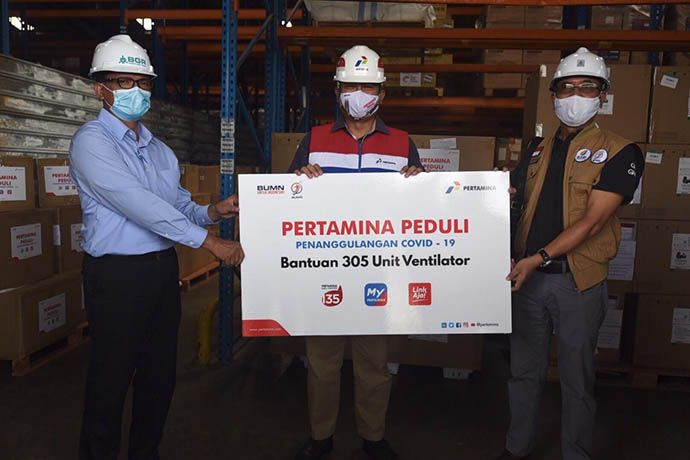 Pertamina memberikan sumbangan ventilator sebanyak 305 unit kepada Yayasan BUMN Hadir Untuk Negeri untuk didistribusikan kepada Rumah Sakit BUMN. Pemberian bantuan tersebut dilakukan di Gudang BGR, Kelapa Gading, Jakarta Utara, Kamis (25/6).