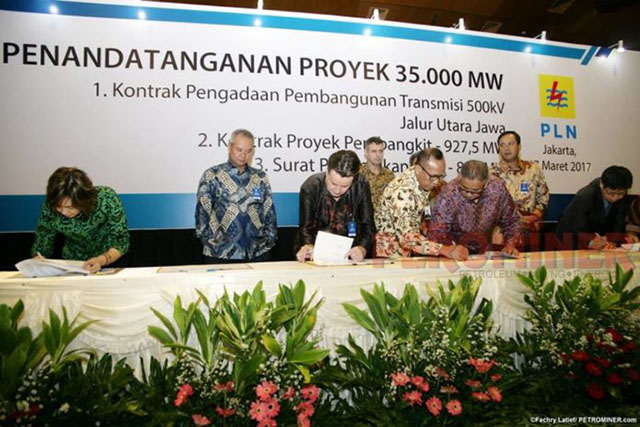 PT PLN (Persero) menandatangani kontrak pembangunan pembangkit dan Gardu Induk (GI) di tiga wilayah yang menjadi bagian dari program 35.000 megawatt (MW).