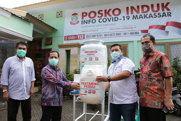 PT Pertamina (Persero) kembali menyalurkan bantuan dalam rangka mencegah penyebaran Covid-19 yakni berupa sarana cuci tangan berupa tandon air. Kali ini, PT Pertamina (Perseo) Marketing Operation Region (MOR) VII menyerahkan bantuan sarana cuci tangan ke Pemerintah Kota Makassar, Kamis (09/04) di Posko Induk Pencegahan Covid-19 Kota Makassar.